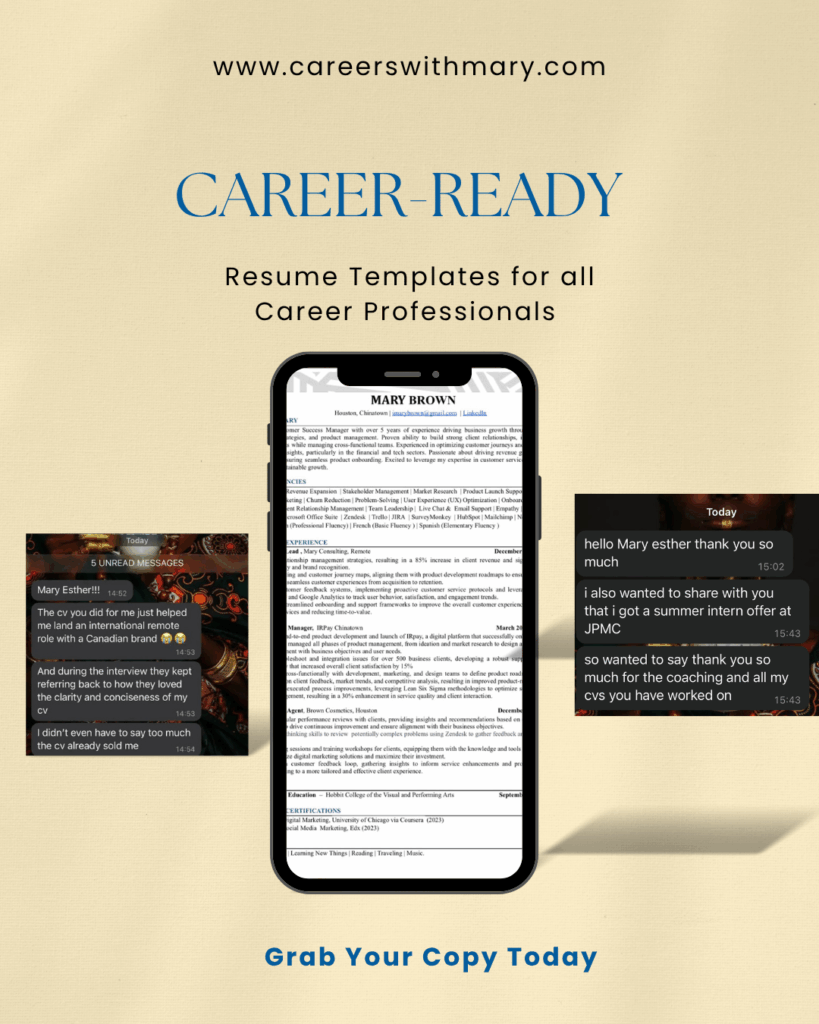 "Heyy MaryEsther! I used your email template plus the CV you drafted for me for my job applications and out of 8 applications, I got called for 3 interviews!! Thank you so much, I'm really grateful"